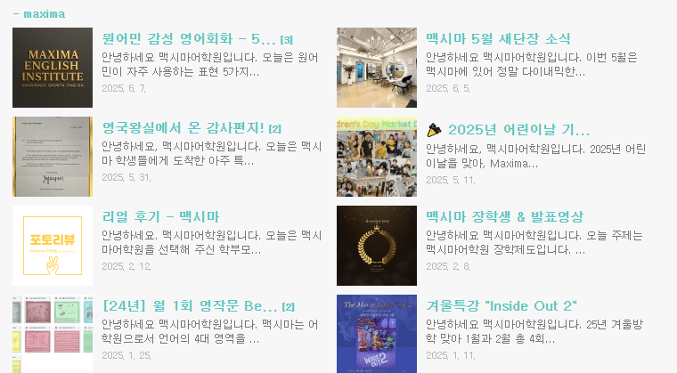 MaximaBuildsConfidence 상담 예약 수업사진 및 영상 - Maxima 프로그램 - Elementary (초등부) - Middle School (중등부) SpeechUsing TED Speeching to build confidence in public speaking. OxfordUsing Oxford University Press books to guide them on their English journey and encourage critical thinking. Maxima CoreMaxima’s own program that prepares middle school students for their exams. ☻정규 원어민 수업 ♕CEFR ✸장학생 제도 ✎월말평가 시스템 ✿월말평가 시스템